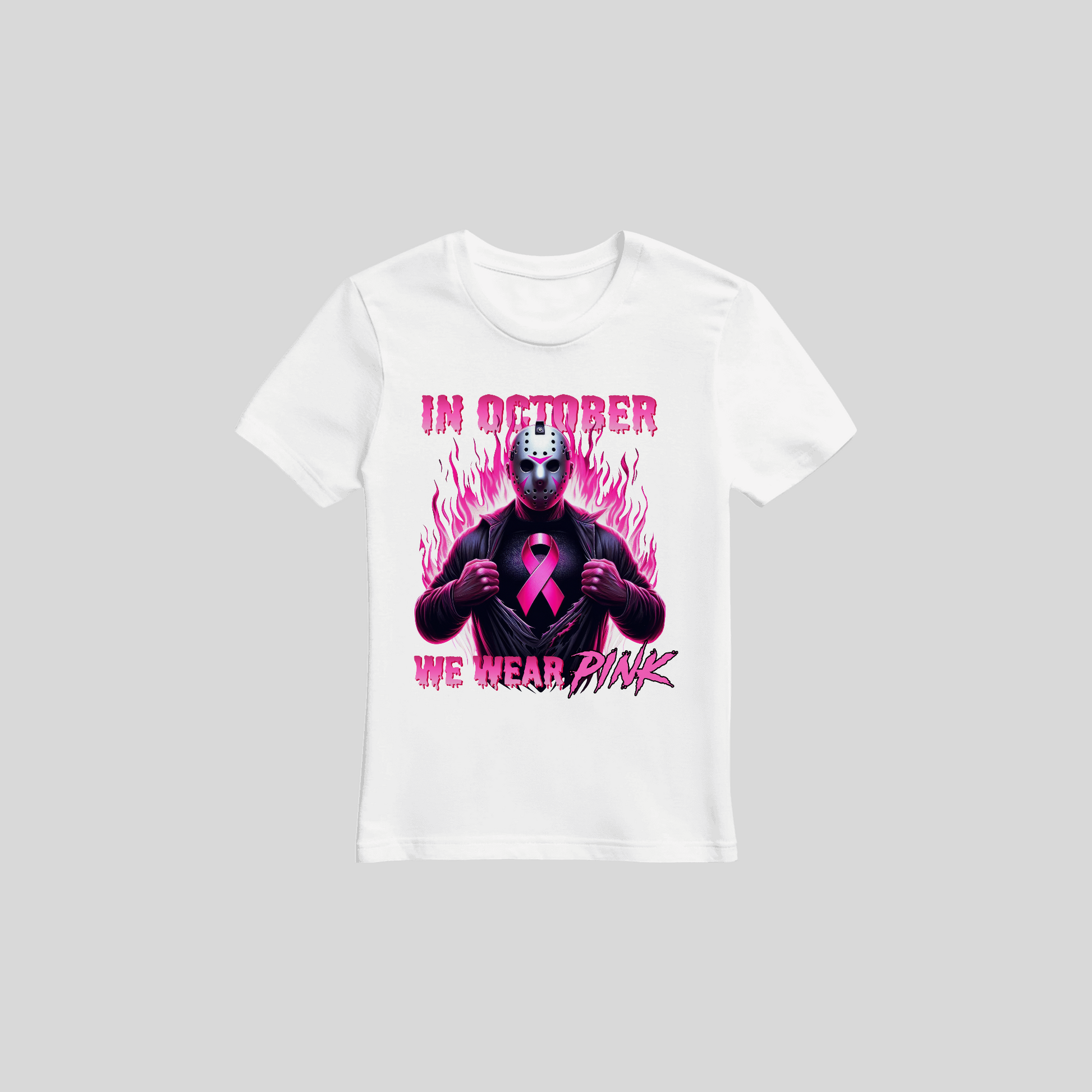 Support Breast Cancer Awareness Month with a playful twist featuring iconic 80’s Halloween characters. This “Friday the 13th” Character supporting Pink October tee brings a rad, nostalgic vibe while showing your support for a great cause. Comfortable and fun, it’s perfect for adding some retro spirit to your awareness efforts.