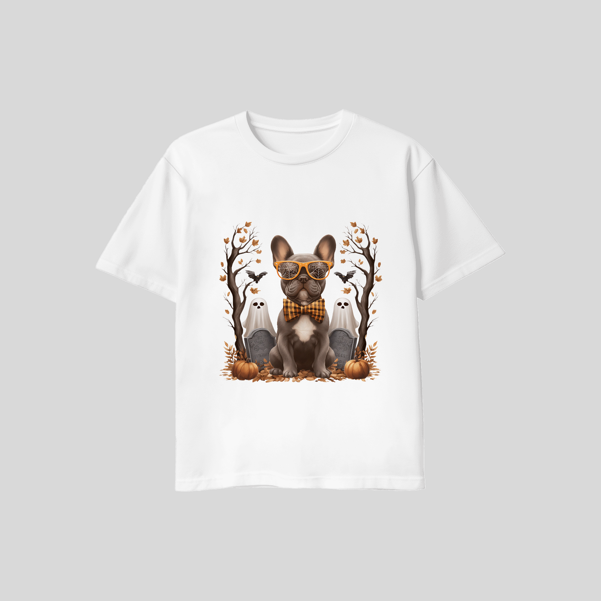 This playful French Bulldog rocks spider web glasses, perfectly set against a festive Halloween backdrop. With his effortlessly cool vibe, he brings a fun and spooky charm to any celebration. Add a dash of adorable Halloween spirit to your collection with this stylish little Frenchie!