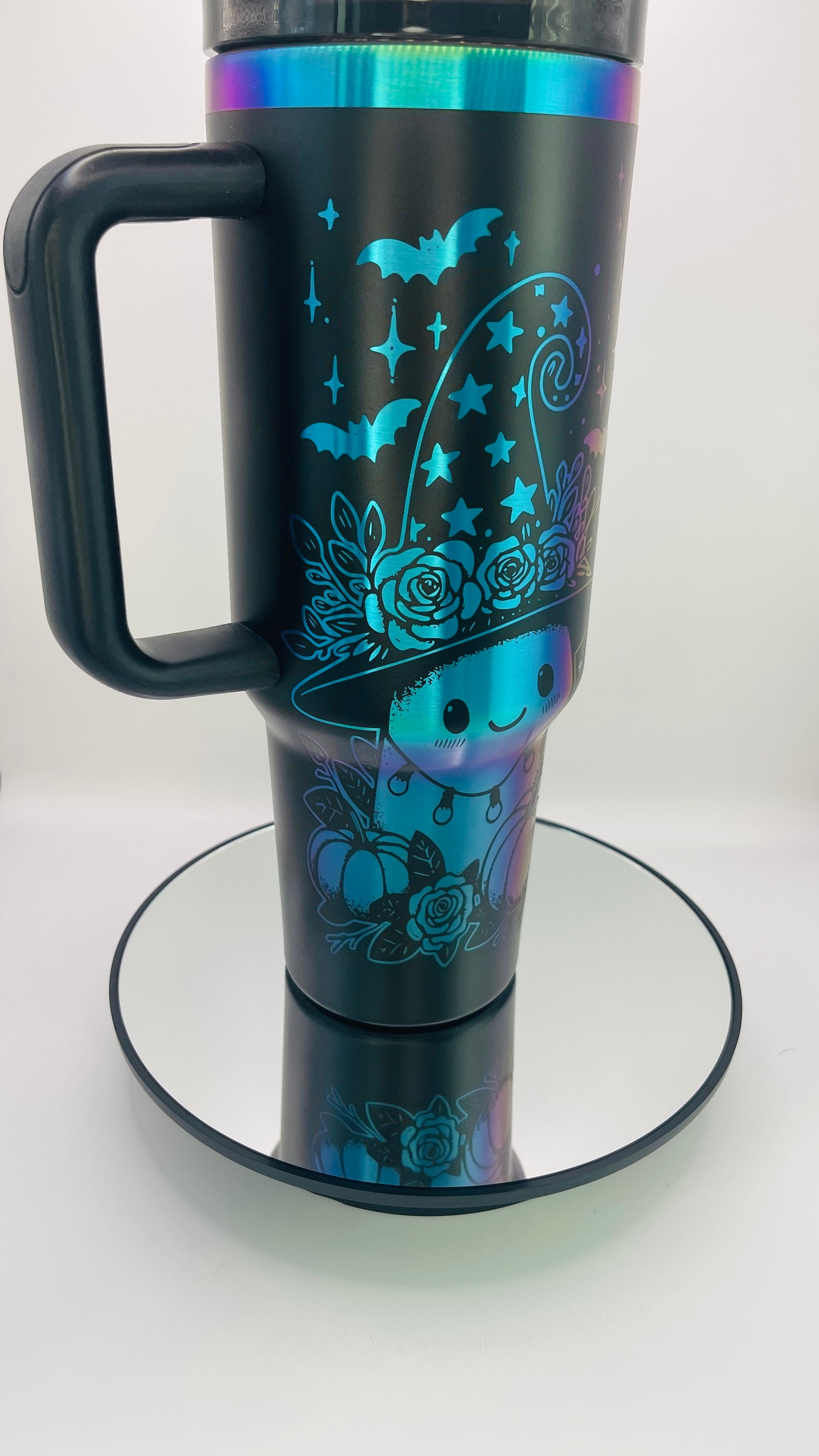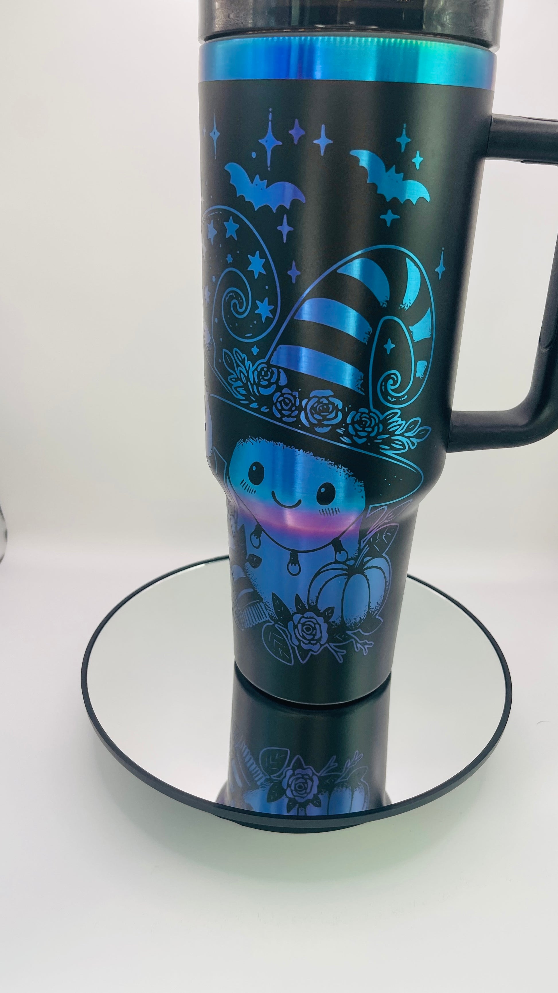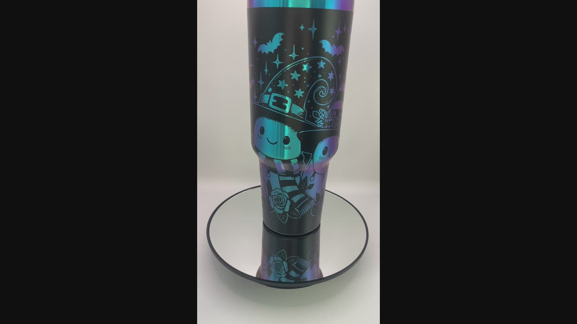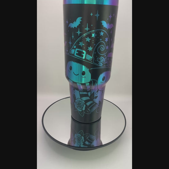 Elevate your Halloween celebrations with this sophisticated 40 oz tumbler featuring three intricately engraved friendly ghosts. Its iridescent finish shifts colors, adding a captivating touch that makes you the centerpiece of any gathering. Designed for both style and functionality, this tumbler combines festive charm with everyday practicality.